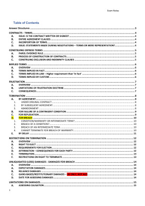 Achieved a final unit mark of 90(High Distinction) in 2024. These exam notes are a useful resource referencing relevant case law and legislation for the LAWS1075/JURD7175 Final Exam. They include all cases studied & very clear structure to answer problem questions. The exam notes cover the following topics: (1) Incorporation of terms (2) Identifying express terms (3) Various implied terms (including Australian Consumer Law) and processes of implication (4) Construction (5) Breach and forms of the same; (6) Common law and statutory damages (7) Rescission and vitiating factors.
