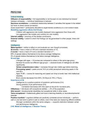 Super summarized notes following learning objectives. Contains all definitions, theories, and principals you need to memorize/understand for the exam. Topic List: Critical Thinking Intelligence Development Health and Wellbeing Language Psychological Disorders Treatment of Psychological Disorders Personality Cross-Cultural Psychology Social Thinking
