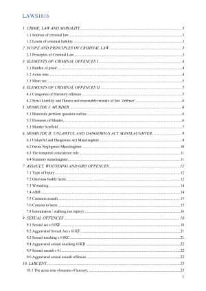 1. CRIME, LAW AND MORALITY 2. SCOPE AND PRINCIPLES OF CRIMINAL LAW 3. ELEMENTS OF CRIMINAL OFFENCES I 4. ELEMENTS OF CRIMINAL OFFENCES II 5. HOMICIDE I: MURDER 6 6. HOMICIDE II: UNLAWFUL AND DANGEROUS ACT MANSLAUGHTER 7. ASSAULT, WOUNDING AND GBH OFFENCES 9. SEXUAL OFFENCES 10. LARCENY 11. EXTENDING CRIMINAL LIABILITY: COMPLICITY 12. EXTREME PROVOCATION (PARTIAL DEFENCE) 13. SELF-DEFENCE AND EXCESSIVE SELF-DEFENCE 14. DURESS AND NECESSITY 16. AUTOMATISM (INVOLUNTARINESS) 15. MENTAL HEALTH IMPAIRMENT; COGNITIVE IMPARMENT; THE PARTIAL DEFENCE UNDER S 23A 17. USE OF EVIDENCE OF (I) MENTAL ILLNESS OR (II) SELF-INDUCED INTOXICATION TO NEGATE INTENT