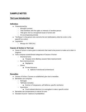 Includes Topics from Weeks 1-10: - Topic 1: What is Tort Law? Damages and Statutory Compensation Schemes - Topic 2: Trespass to the Person - Topic 3: Trespass to the Person (cont.) - Topic 4: Proprietary Torts - Topic 5: Negligence - Introduction and Duty of Care Introduction to Negligence - Topic 6: Negligence - Special Duty of Care Situations: Omissions and Mental Harm - Topic 7: Negligence - Breach of Duty - Topic 8: Negligence - Causation and Remoteness - Topic 9: Negligence - Defences - Topic 10: Torts Arising from Statutory Duties and Powers - Topic 11: Vicarious Liability, Non-Delegable Duty, and Multiple Tortfeasors INCLUDES ROADMAP AT THE BOTTOM