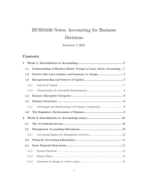 Introductory accounting notes covering the first year accounting unit for commerce BUSS1040. Topics are organised by week and include: Week 1 - Introduction to Accounting (I) Week 2 - Introduction to Accounting (II) Week 3 - The Business Plan - CVP Analysis Week 4 - The Business Plan - Budgeting Week 5 - Revision Week 6 - The Accounting System: Concepts and Applications I Week 7 - The Accounting System: Concepts and Applications II Week 8 - Internal Control Week 9 - The Income Statement Week 10 - The Balance Sheet Week 11 - The Cash Flow Statement Week 12 - Professional Decision-Making & Corporate Governance