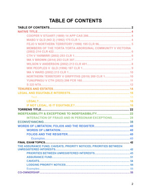 These are HD notes that are comprehensive enough that nothing is missed, but short enough that it won't take too long in an exam to flick through, as such, certain words have been shortened :) All the cases have been highlighted to make it easier to find the authority in exam conditions. See my other notes too! Topics covered: Native Title Tenures and Estates Legal and Equitable Interests Torrens Title Indefeasibility & Exceptions to Indefeasibility eConveyancing Words of Limitation; Folios and the Register The Assurance Fund; Caveats; Priority Notices; Priorities Between Unregistered Interests Co-ownership Leases & Licences Mortgages Easements & Profits à Prendre Covenants