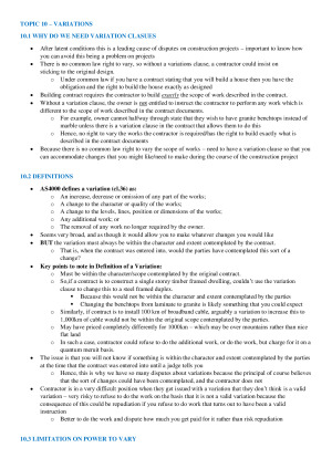 ALL EXAMINABLE TOPICS INCLUDED. Comprehensive notes that include detailed and easy to understand content AND case summaries. This is all that I needed in the exam to confidently answer each question and achieve a HD. TOPIC 2 - RISK ALLOCATION TOPIC 3 – OVERVIEW OF THE CONSTRUCTION INDUSTRY; KEY PLAYERS; INDUSTRY CULTURE AND BEHAVIOUR & TENDERING TOPIC 4 – LATENT CONDITIONS TOPIC 6 – TIME, PROGRAMMING AND LIQUIDATED DAMAGES TOPIC 7 – PAYMENT TOPIC 8 – THE WORLD BEYOND THE HEAD CONTRACT TOPIC 9 – QUALITY OF BUILDING WORK TOPIC 10 – VARIATIONS TOPIC 11 – ROLE OF THE SUPERINTENDENT TOPIC 12 – SECURITY FOR PERFORMANCE TOPIC 13 – INSURANCE TOPIC 14 – POLICY/REGULATORY ISSUES TOPIC 15 – HOW TECHNOLOGY IS CHANGING THE CONTRUCTION INDUSTRY