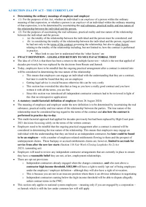 ALL TOPICS INCLUDED. Comprehensive notes that include detailed and easy to understand content AND case summaries. This is all that I needed in the exam to confidently answer each question and achieve a HD. TOPIC 1 (PART 1) – SOURCES OF EMPLOYMENT REGULATION AND MINIMUM EMPLOYMENT STANDARDS TOPIC 1 (PART 2) – ENFORCEMENT OF MINIMUM EMPLOYEMNT STANDARDS TOPIC 2 – FORMING AN EMPLOYMENT CONTRACT & INCLUDING CASUAL EMPLOYMENT TOPIC 3 – TERMS OF THE EMPLOYMENT CONTRACT TOPIC 4 – IMPLIED EMPLOYEE DUTIES TOPIC 5 – IMPLIED EMPLOYER DUTIES TOPIC 6 – THE CONTEXT AND NATURE OF WORKING ARRANGEMENTS, PARTICULARLY EMPLOYEES AND INDEPENDENT CONTRACTORS TOPIC 7 – UNFAIR DISMISSAL TOPIC 8 (PART 1) – TERMINATION AND REMEDIES: TERMINATION OF EMPLOYMENT TOPIC 8 (PART 2) – TERMINATION AND REMEDIES: REMEDIES TOPIC 9 (PART 1) – ANTI-DISCRIMINATION, HARASSMENT, SEXUAL HARASSMENT, VICTIMISATION AND BULLYING PROTECTIONS, AND FLEXIBLE WORK ARRANGEMENTS TOPIC 10 – GENERAL PROTECTIONS (INCLUDING ADVERSE ACTION) UNDER THE FW ACT