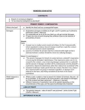 This is exam notes only for the hypo, not essay. Notes follow the structure of remedies available for each cause of action including: - contracts - torts - ACL