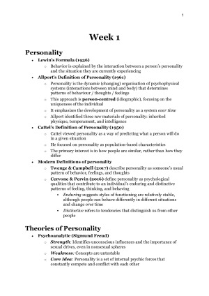 High quality resource which covers all examinable subject material, cleaned up and easy to follow. Contains extra readings / research to help explain the harder and more important parts of the course. You got this. Contents Week 1: What is personality? Week 2: Main Theories of Personality I Week 3: Main Theories of Personality II Week 4: Psychodynamic and Motivational Theories Week 5: Testing and Measurement Week 6: Personality Changes Over Time Week 7: Personality, Health and Wellbeing Week 8: Personality Disorders Week 9: Cognition Week 10: Personality in the Workplace