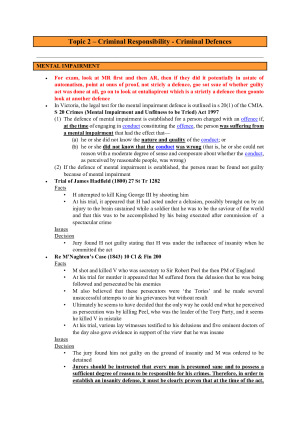 All topics/weeks covered. Topics include: - Introduction and Review of Principles - Criminal Responsibility – Criminal Defences - Property Offences: Theft - Inchoate Offences: Attempts - Inchoate Offences: Complicity - Criminal Procedure: Arrest, Detention and Bail - Criminal Procedure: Trial Process, ADR, Committal Proceedings - Criminal Law and Regulation: Strict Liability and Mistake - Drug Offences - Corporate Criminal Liability Covers content from the semester in a concise manner. Goes over the main/relevant information required for all assessments including the exam.