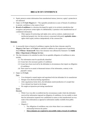 All topics/weeks covered. Topics include: - Equity as an Element of the Legal System - Breach of Confidence - Breach of Fiduciary Duty - Personal Remedies in Equity - Proprietary Remedies in Equity - Assignment of Property Rights in Equity Covers content from the semester in a concise manner. Goes over the main/relevant information required for all assessments including the exam.