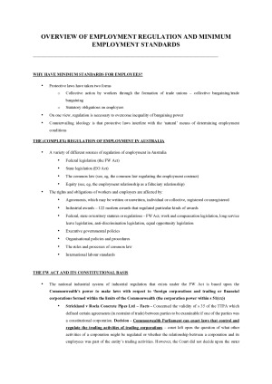 All topics/weeks covered. Topics include: - Overview of Employment Regulation and Minimum Employment Standards - Employees vs Independent Contractors - Forming an Employment Contract - The Employer’s Implied Duties - Unfair Dismissal Under the FWA - General Protections (Adverse Actions) Under the FWA Covers content from the semester in a concise manner. Goes over the main/relevant information required for all assessments including the exam.