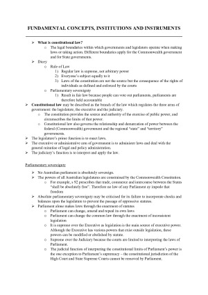 All topics/weeks covered. Topics include: - Fundamental Concepts, Institutions and Instruments - State Legislative Power - Manner and Form Requirements - Characterisation - The External Affairs Power s 51(XXIX) - The Corporation Power s 51 (XX) - Financial Powers - Implied Intergovernmental Immunities - The Separation of Judicial Power - Implied Political Freedoms - s 92: Freedom of Interstate Trade and Commerce - Inconsistency and s 109 Covers content from the semester in a concise manner. Goes over the main/relevant information required for all assessments including the exam.