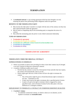 All topics/weeks covered. Topics include: - Termination - Remedies for Breach - Frustration - Vitiating Factors - Impropriety by Third Parties - Remedies for Misleading or Deceptive Conduct Under Statute Covers content from the semester in a concise manner. Goes over the main/relevant information required for all assessments including the exam.