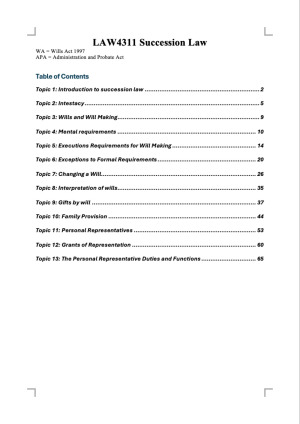 A comprehensive set of lecture notes with integrated case notes to help you achieve a HD in both your written assignments and take-home exam. The note includes all the information you need to ace this unit. Topic covers: Topic 1: Introduction to succession law 2 Topic 2: Intestacy 5 Topic 3: Wills and Will Making 9 Topic 4: Mental requirements 10 Topic 5: Executions Requirements for Will Making 14 Topic 6: Exceptions to Formal Requirements 20 Topic 7: Changing a Will 26 Topic 8: Interpretation of wills 35 Topic 9: Gifts by will 43 Topic 10: Family Provision 50 Topic 11: Personal Representatives 59 Topic 12: Grants of Representation 66 Topic 13: The Personal Representative Duties and Functions 72