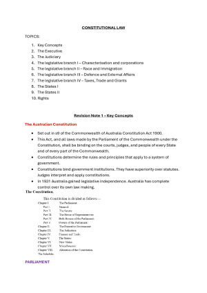 Notes from material such as lecture material, additional reading and from Blackshield and Williams Australian Constitutional Law and Theory. Notes from modules 1-10 plus a large volume of practice questions with answers at the end. Notes to be taken into the open book exam. Grade achieved from using these study notes: 86% / High Distinction.