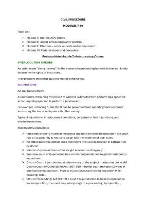 Civil Procedure full study notes of units 7 to 10 to be taken into open book exam. Grade achieved from notes: 75% - Distinction. Notes from lecture notes, additional resources and book Australian Civil Procedure thirteenth edition by Bernard Cairns. Short number of practice exam questions included.