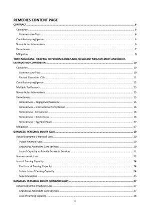 Summary notes used to learn the Remedies course. Ranked 1st place and received a HD using these notes. The remedies exam covers every single topic, so these notes have it all - personal injury, property damage, remedies in tort, contract, equity, misleading and deceptive conduct, restitution etc. They are long and detailed, because there is so much content to cover, but I made helpful summary boxes for each topic to help you nail each type of remedy/situation. They set out how to answer each particular type of question.