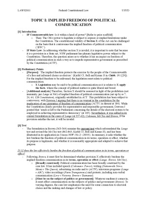 These notes cover everything you need for the final exam to navigate tricky problem questions quickly and effectively. A problem you might experience when using the notes of other students is that they are often written in a way that is unique to them. In turn, things that they might deem crystal clear can feel confusing or incomplete when you're trying to apply them under exam pressure. My approach to exam scaffolds is a bit different. I make sure my notes can walk me through each issue step-by-step, providing a clear scaffold that I can transcribe almost word-for-word onto the paper. This allows me to avoid the pressure of the exam interfering with my answers. It also means that anyone should be able to walk into an exam hall with just these notes and confidently answer any question that is thrown their way. In saying that, the best way to use these notes is to not wait until before your final exam to buy/ look at them. Instead, I recommend taking them to class and adjusting them to your liking, making note of anything your tutor places particular emphasis on (such as notable dissenting judgements). So, if you are looking for a set of notes that are: - Comprehensive and provide extra pieces of case analysis to bolster your responses, - Based on case readings, textbooks and seminars, - Easy to understand and follow, - Reasonably priced, and - Exam-ready I think you will find these notes to be a worthwhile investment. Furthermore, as a consistent high-achiever and student of the Dean’s List, you can rest assured that your notes are of high quality. Topics covered: - Topic D (Corporations) - Topic E (Races) - Topic F (Taxation and Grants) - Topic G (Defence and the Doctrine in the Communist Party Case) - Topic H (Freedom of Interstate Trade and Intercourse) - Topic I (Implied Freedom of Political Communication) - Topic J (Intergovernmental Immunities) If you are in your penultimate year, I wish you all the best and hope these notes can assist you in achieving your academic goals for the year. Good luck!