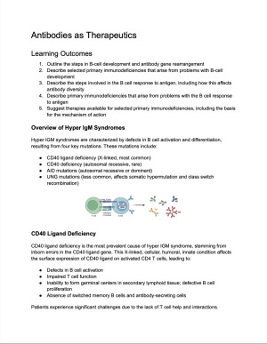 Selling my highly detailed and well-organised notes for BIOM30002 Biomedicine: Molecule to Malady. This document pertains to the B cells and Diseases topic. I am a University of Melbourne Dean’s Honours List recipient, and I achieved an H1 (87) in this subject using these notes. This document covers: B Lymphocyte Biology and Diseases Antibodies as Therapeutics The notes are: Structured around learning outcomes Highly detailed and exam-focused Supported by clear diagrams and images to aid understanding and retention These notes are ideal for: Building a strong conceptual understanding of B cell biology and immune disease Efficient revision for quizzes, MSTs, and exams Clarifying complex immunology content in a concise, organised format I also have notes for all other topics in BIOM30002, as well as a single document containing the full subject notes, available if you’re interested. Perfect for students aiming for a strong H1 in BIOM30002.