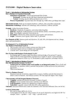 Includes: Lecture notes + content diagrams Content: Week 2 - Introduction to Information Systems Week 3 - Introduction to Business Processes Week 4 - Strategy & Competitive Advantage Week 5 - Databases Week 6 - Entity Relationship Diagrams Week 7 - Ethics Week 8 - Business Process Management (BPM) Week 9 - Business Process Management Notation (BPMN) Week 10 - Process Improvements Week 11 - Social Media Information Systems Week 12 - Business Intelligence Systems Score a HD with these notes!
