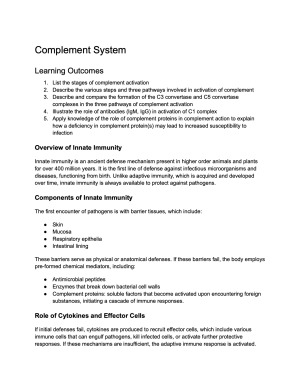 Selling my highly detailed and well-organised notes for MIIM30002 Principles of Immunology, covering Module 1: Innate Immunity. I am a University of Melbourne Dean’s Honours List recipient, and I achieved an H1 (85) in this subject using these notes. This document covers innate immunity in depth, including: Complement system pathways and regulation Phagocytes and mechanisms of pathogen clearance Pattern recognition receptors and signalling pathways Other innate immune responses and effector mechanisms The notes are: Structured around learning outcomes Highly detailed, clear, and exam-focused Supported by diagrams and images to aid understanding of complex immunological processes These notes are ideal for: Building a strong foundation in core immunology concepts Efficient revision for MSTs and final exams Clarifying dense lecture content in a concise, organised format I also have notes for all other modules in MIIM30002, as well as a single document containing the full subject notes, available if you’re interested. Great resource for students aiming for a strong H1 in MIIM30002.