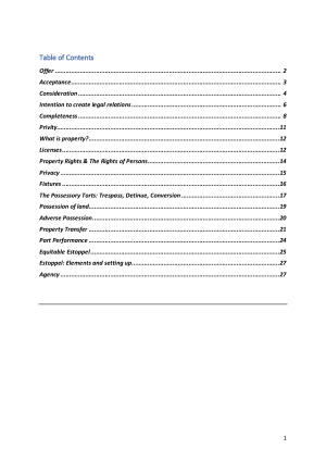 Achieved a final unit mark of 90 (High Distinction). These summary notes are a useful resource referencing relevant case law and legislation for the LAWS1150/JURD7150 Final Exam. The notes cover: 1. Contract (agreement, consideration, intention and certainty); 2. Privity (and exceptions thereto); 3. Remedies; 4. Property and property interests, including fixtures, chattels, and adverse possession; 5. Torts applicable to property interests; 6. Bailments; 7. Equitable doctrines of conversion and part performance; and 8. Estoppels and remedies. Flowchart diagrams are also included for licenses, property interests, adverse possession, and estoppels.
