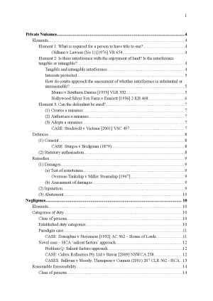 Comprehensive, straight to the point yet DETAILED notes for LAWS1061/JURD7161. Received 88/100 for my overall course mark. Written in table format for accessibility during exams. Follows the IRAC formula for answering problem questions. Includes specific cases and legislation throughout template. Does not include unnecessary wording to save time during exams. Topics Covered include: 1) Breach 2) Causation 3) Contributory Negligence 4) Voluntary Assumption of Risk 5) Concurrent Liability 6) Breach of Statutory Duty 7) Economic Damages 8) Non-Economic Damages