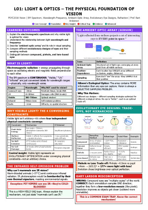 This is a complete PSYC2016 subject summary, not a slide dump or raw lecture notes. It rewrites the entire unit into exam-style explanations, tables and self-tests you can use straight for MCQs, short answers and essays. VISION (L01–L10) L01: Light & Optics – The Physical Foundation of Vision Electromagnetic spectrum, why visible light is “special,” ambient optic array (Gibson), evolutionary eye designs (compound, pinhole, lens, mirror), and the infrared self-emission problem in mammals. L02: Eye Anatomy & Photoreceptors Cornea, pupil, lens, retina, fovea vs periphery, rods vs cones, duplex system, dark adaptation curves, and what “visual acuity” actually depends on. L03: Trichromacy & Colour Vision Young–Helmholtz trichromatic theory, S/M/L cone sensitivities, dimensionality reduction, why colour is a ratio code not a wavelength, intro to metamers. L04: Weighted Sums & Principle of Univariance Photoreceptors as scalar devices, intensity–wavelength ambiguity, why a single cone type can’t encode colour, need for comparing multiple channels. L05: Metamers & Limits of Trichromacy Metamer examples, colour matches, why different spectra produce identical percepts, colour deficiencies (protanopia, deuteranopia, tritanopia) and their perceptual consequences. L06: CIE Chromaticity Diagram & Colour Gamuts x–y chromaticity space, spectral locus, white point, additive primaries, monitor/TV colour gamuts, how devices fake “all” colours with three guns. L07: Receptive Fields & Physical vs Perceived Brightness Centre–surround receptive fields, lateral inhibition, simultaneous contrast and Mach bands, why the image on the retina ≠ what we see. L08: Hermann Grid & Convolution Filters Classic Hermann Grid illusion, problems with the original explanation, spatial frequency / convolution view of the visual system, edge-detection filters. L09: Redundancy Reduction & Colour Opponent Cells Opponent-process coding (L–M, S–(L+M), black–white), redundancy reduction, efficient coding, and why opponent cells explain afterimages and unique hues. L10: Perceptual Constancy & Visual Illusions Lightness and colour constancy, size and shape constancy, the role of context and assumptions, canonical illusions (checker shadow, Adelson) as “rational” inferences gone wrong. AUDITION & CONSCIOUSNESS (L11–L15) L11: Audition I – Sound and Timbre Physical vs psychological properties of sound (frequency, amplitude, complexity), Fourier decomposition, outer/middle/inner ear, timbre as spectral envelope. L12: Hair Cells, Frequency Coding & Deafness Inner vs outer hair cells, place vs temporal coding, phase locking limits, tonotopic mapping, conductive vs sensorineural vs central hearing loss, audiograms. L13: Spatial Hearing & Sound Localization ITDs and ILDs, head-related transfer functions (HRTFs), cone of confusion, spectral cues from the pinna, duplex theory of localization. L14: Consciousness I – Foundations What we mean by “consciousness,” phenomenal vs access consciousness, classic philosophical problems, how we can study consciousness scientifically. L15: Consciousness II – NCCs & Models Neural correlates of consciousness, blindsight, neglect, split-brain findings, major models (global workspace, higher-order, etc.) and their predictions. ATTENTION (L16–L20) L16: Attention I – Bottlenecks & Overt/Covert Why attention is needed, spotlight vs filter metaphors, early vs late selection, dichotic listening, overt vs covert attention shifts. L17: Attention II – Mechanisms (How & Why We Attend) Endogenous vs exogenous attention, spatial vs object-based selection, load theory, mind-wandering and resource limits. L18: Visual Search & Feature Integration Theory Feature vs conjunction search, parallel vs serial search slopes, Treisman’s Feature Integration Theory, binding problem, illusory conjunctions. L19: Change Blindness & Inattentional Blindness Flicker and “door” paradigms, inattentional blindness (gorilla), why large changes are missed, what this reveals about visual representations and real-world implications (driving, eyewitnesses). L20: Selection History & Value-Modulated Attention Selection history as a third source of control (beyond bottom-up/top-down), value-modulated attentional capture (VMAC), reward learning and attentional bias. MEMORY (L21–L26) L21: Memory I – Cognitive Foundations Basic memory architecture, encoding–storage–retrieval, evidence for multiple systems, classic case studies (HM, KF) and what they show. L22: Memory II – Memory Systems & Working Memory Sensory memory (iconic/echoic), STM vs LTM, Baddeley’s working memory model (phonological loop, visuospatial sketchpad, central executive, episodic buffer), Cowan’s embedded-processes model. L23: Memory III – WM Individual Differences & LTM Systems Working memory capacity (WMC), simple vs complex span tasks, attention control account, episodic vs semantic LTM, how WMC relates to reasoning and comprehension. L24: Memory IV – Explicit vs Implicit & Process Declarative vs non-declarative systems, priming, skill learning, conditioning, process dissociation, how to separate conscious and unconscious influences. L25: Memory V – Neuroscience, Network Models & PDP MTL and hippocampus, consolidation and reconsolidation, distributed representations, connectionist/PDP models of memory, pattern completion and pattern separation. L26: Memory VI – Embodied Cognition, Episodic vs Semantic Embodied memory effects (sensorimotor grounding), how episodic and semantic memory interact, autobiographical memory, simulation accounts of remembering. THINKING & DECISION MAKING (L27–L32) L27: Thinking I – Introduction to Higher-Order Cognition Defining thinking as operating on representations, four aspects and five themes, where perception ends and thinking begins, why representation matters. L28: Thinking II – Problem Solving Well- vs ill-defined problems, Gestalt insights (restructuring, “ah