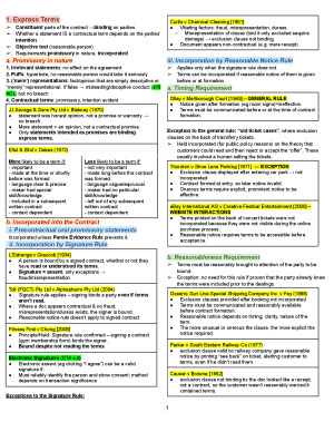 These notes cover all necessary cases/legislation/principle etc. we have covered in the lectures, tutorials and the textbook relevant to the exam. (After week 4) Topics include: 1. Express Terms 2. Implied Terms 3. Construction of Terms 4. Discharge of Contracts 5. Vitiating Factors 6. Writing Requirement 7. Illegality 8. Privity The notes are detailed enough with case summaries, pinpoint legislations and definitions but remain at 20 pages so you can use it for your exam. The notes also have significant amount of colour coding, tables and also diagrams.