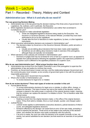Complete semester notes: Week 1: Introduction; theory, history and context; and constitutional considerations Week 2: Executive power and administrative decision-making; subordinate legislation and delegated decision-making Week 3: Merits review - tribunals (their nature, role and structure); procedure and evidence of tribunals Week 4: Merits review - other review methods and bodies; recap of merits review; intro to judicial review Week 5: Judicial review - introduction; statutory framework and common law review Week 6: limits on judicial review - legality/ merits distinction; justiciability; standing; privative clauses; 'matter' Week 7: Unauthorised decision-making Week 8: judicial review - grounds for review (statutory and common law); law, fact and evidence Week 9: jurisdictional error and jurisdictional fact; procedural fairness/ natural justice Week 10: statutory purpose and relevant considerations; unreasonableness, fraud and bad faith Week 11: Judicial review remedies; obtaining reasons for decisions Week 12: Access to information and privacy; putting it all together