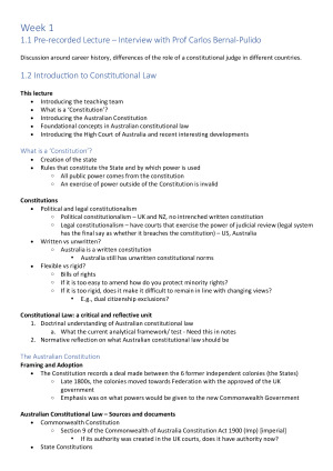 These notes cover the following topics: - Introduction to Australian Constitutional Law - Indigenous Peoples and the Constitution - Characterisation and Constitutional Interpretation, Federalism, and State Constitutional Law - Corporations Power - External Affairs Power - Statutory Executive Power, Prerogative Power, and Nationhood Power - Defence Power - Federal and State Separation of Judicial Power - Financial Powers and Grants - Intergovernmental Immunities and Inconsistency of Laws - Freedom of Interstate Trade - Approaches to Rights Protection - Express and Implied Rights and Freedoms - Constitutional Reform