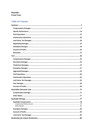 These hypo notes cover the entire Remedies course and are designed for the FINAL EXAM. They integrate all relevant cases and secondary reading materials. The hypo structures include the precise wording used for the exam response. These notes achieved a 90 (H1) subject score. Topics addressed include: 1. Intro to remedies 2. Compensatory damages for breach of contract 3. Compensatory damages in tort 4. Statutory damages under the acl 5. Equitable compensation 6. Vindication/punishment 7. Specific performance 8. Permanent injunctions 9. Interlocutory injunctions 10. Lord cairns' act damages 11. Gain-based remedies 12. Restitution for unjust enrichment 13. Rescission