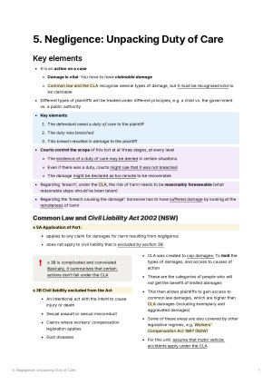 COMPREHENSIVE study notes following the lecture curriculum at Macquarie University. Although I am a JD student, the subject was also taken by undergraduates, so this set of notes will also work for undergrads. Everything is COLOUR-CODED based on cases, legislation, important points, principles, tests and overviews/summaries (see sample). TOPICS: Introduction and Intentional Torts Trespass to Person and Interference with Chattels Trespass to Land and Public Nuisance Defences to International Torts Negligence: Overview Negligence: Categories (physical and psychiatric harm) Negligence: Categories (wrongful death and pure economic loss) Negligence: Special Parties Negligence: Standard of Care and Breach of Duty Negligence: Causation Negligence: Damage and Remoteness Negligence: Concurrent Liability and Defences
