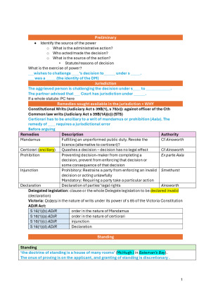 The first section of notes is handcrafted to be applicable to any potential issue arising in an Administrative Law exam, structured to be copy/pasted/paraphrased for the Issue and Rule followed by step-by-step questions to answer in analysis with analogies for that H1 critical analysis (pre-written text is in blue). These are the most straightforward set of notes to ensure you do well in your exam. I used these notes to achieve 94% in the exam and an overall 90 in Administrative Law. The second section of notes is my general class notes (starting from page 23). Topic list: Part I. Introduction to Administrative Law Topic 1 – Administrative Law in a Nutshell Part II: A Closer Look at the New Administrative Law Reforms Topic 2 – Australia’s Distinctive Administrative Law Framework Topic – The Values and Principles Underpinning the New Topic : Freedom of Information Topic – The Office of Ombudsman Topic – Commonwealth and Victorian Merits Review Part III: Judicial Review Topic 3 – The Courts’ Supervisory Jurisdictions and the Remedies Judicial Review Can Provide Topic 4 – Standing: Who Has the Right to Bring a Legal Proceeding Topic 5 – Framing the Courts’ Supervisory Jurisdiction Over Administrative Action – What Is Judicial Review? Topic 6 – Procedural Fairness Topic : Procedural Fairness: Threshold Issues Including Statutory Exclusion Topic – Procedural Fairness: The Hearing Rule Topic – Procedural Fairness: Bias Topic 7 – Error as to Jurisdictional Fact – Question 1: Two Types: Objective or Subjective Exe Power Expansion – Question 2: What the Court’s Role Is Topic 8 – Acting Without Legal Authority Topic 9 – Inflexible Application of Policy Topic 10 – Invalid Delegation of Discretionary Power Topic 11 – Relevant/Irrelevant Considerations Topic 12 – Unreasonableness Topic 13 – Privative Clauses and Other Limitation Devices Topic 14 – Judicial Review of Delegated Legislation Topic 15: Charter of Human Rights and Responsibilities Act 2006 (Vic)
