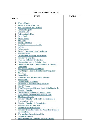 Stop wasting hours scrolling through dense textbooks and capture the "A" grade you deserve with this ultimate ten-week Equity and Trusts master guide! This comprehensive resource is expertly curated to map out every single week of your semester, beginning with the historical foundations of Equity and the core "no-profit" and "no-conflict" fiduciary rules in Week 1 , before moving into the essential classification and functions of trusts in Week 2 . You will achieve week-by-week mastery of the "three certainties" in Week 3 , the formalities of constitution in Week 4 , and the complexities of charitable purpose trusts in Week 5 . The guide then dives into the administrative and management duties of trustees in Week 6 , third-party liability under the "stormy seas" of Barnes v Addy in Week 7 , and resulting trusts in Week 8 . Finally, you can dominate the end of the course with a pro-level understanding of tracing and equitable remedies in Week 9 and the intricacies of Quistclose and constructive trusts in Week 10 . Featuring a hyperlinked index for instant navigation and four pre-written quizzes with model answers to ensure you are exam-ready , these notes are the perfect companion for excelling in your law degree.