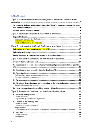 The notes cover the latest topics (updated in 2025 S1), which include: 1. Administrative law in constitutional context 2. 'New Administrative Law' institutions and values 3. Authorised decision-makers (delegation and agency) 4. Substantive conditions on administrative decisions 5. Procedural conditions on administrative decisions 6. Preconditions to power 7. Delegated legislation 8. Supervisory jurisdictions. 9. Remedies 10. Standing 11. Jurisdictional error 12. Entrenched review 13. Invalidity 14. Public functions 15. Soft-law 16. Administrative reason-giving The notes are detailed enough to make you understand the whole course, and concise enough to make you avoid spending time on contents that are not exam-related.