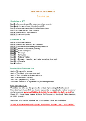 Comprehensive civil practice notes used to learn the course. Came first and scored a HD (90%) in the course using these notes. Topics covered include: Introduction Access to Justice, Open Justice and Client Care ADR, Jurisdiction, Limitation Perios Initiating Proceedings, Commencing Litigation, Joining Parties, Drafting Pleadings Service Evidence Interlocutory Applications and Injunctions Costs Settlement Strike-out, Summary Disposal, Vexatious Litigants Enforcing Judgements Appeals