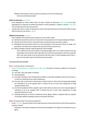 These notes provide step-by-step guidance across key topics in the unit, breaking down concepts into clear frameworks that are easy to follow and apply in exams. They include detailed case explanations, going beyond what is typically covered in lectures, with careful analysis of facts so you can analogise in the exam. All relevant legislative provisions are referenced throughout for each topic covered in the unit. ALSO INCLUDES an exam checklist for certain topics. Lecturers have consistently noted that LDR is one of the most challenging subjects in which to achieve a HD and have emphasised the importance of detailed and well-structured notes. TOPICS COVERED: - pre-litigation steps & ADR - costs in litigation - jurisdiction, parties and claims - commencing proceedings, service and appearance - defining the issues in dispute and summary disposition - urgent applications - gathering evidence - judgement, enforcement and evaluating civil litigation - class actions