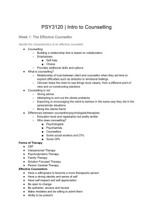 Week 1: The Effective Counsellor Week 2: Basic Counselling Skills Week 3: Ethical and Professional Issues in Counselling Week 4: Psychoanalytic Approaches: Freud, Jung and Adler Week 5: Humanistic Approaches: Existential, PCT, Gestalt Week 6: Behavioural Therapy and CBT Week 7: ACT, DBT and Mindfulness Week 8: Family Systems Approach Week 11: Feminist Therapy and Integration