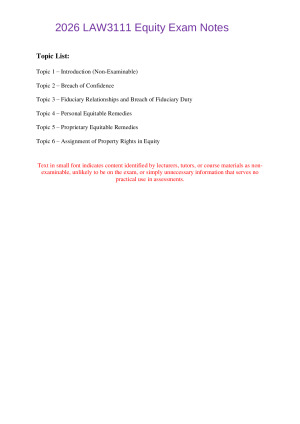 These comprehensive LAW3111 Equity Law notes (which are HD proven on assessments) cover all topics assessed in the mid-semester assessments AND the exam. With over 70 pages, they are meticulously detailed and have been curated by synthesizing a wide array of authoritative resources, including the course textbook, class PowerPoint presentations, Seminar Slides, and most importantly the author's own personal notes from attending lectures and tutorials. The notes not only cover all examinable content but also assist with the structure and answering of questions. They provide detailed steps for addressing different legal issues, along with checklists and pre-formulated case analogies for quick application in scenarios where exam facts correspond with case law. These notes are designed to be the ultimate one-stop resource for Equity law, a tool I deeply wished for during my own studies of this unit. Now, you have the opportunity to benefit from hundreds of hours of my meticulous work, all available for a small fee. Topics Included: Topic 1 – Introduction (Non-Examinable) Topic 2 – Breach of Confidence Topic 3 – Fiduciary Relationships and Breach of Fiduciary Duty Topic 4 – Personal Equitable Remedies Topic 5 – Proprietary Equitable Remedies Topic 6 – Assignment of Property Rights in Equity