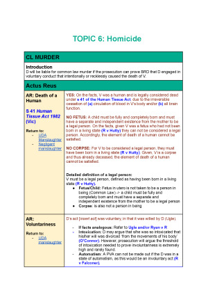 These notes cover all topics in the unit to assist you when completing both mid-semester assessments as well as the end of semester exam and allowed me to achieve an overall HD of 82. These notes are highly detailed (156 pages) and include a step by step structured exam script that you can use to address all possible scenarios and is designed to allow you to tailor your response to each specific factual scenario. It also includes the relevant analogous cases for quick application during an exam and more nuanced answers (with full case summaries located at the end for additional reference -> colour coded to match with the corresponding elements). All relevant legislation is also included. FULL TOPIC LIST: Topic 1: Introduction Topic 2: Sentencing Topic 3: Elements of a Crime Topic 4: Non Fatal Offences Topic 5: Sexual Offences Topic 6: Homicide Topic 7: Manslaughter Topic 8: Defences Cases Legislation