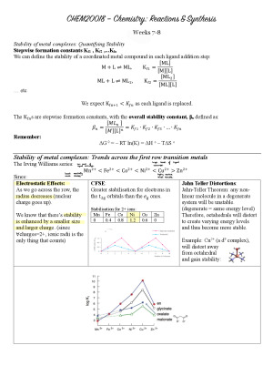 Weeks 7-12: Comprehensive Lecture & Tutorial Summaries for CHEM20018. I used these notes to revise and consolidate, and got an 89 for the subject overall. Topics covered: W7-W8: Stability of metal complexes, HSAB theory for coordination complexes, substitution reactions in metals, reaction mechanisms W9-10: speed, work, internal energy, heat, enthalpy, free energy, Carnot Cycles W11-12: bonding (primary and secondary), Lennard-Jones Potential, Couloumb's Equation, Crystal Band formation, doping, p- and n- junctions.
