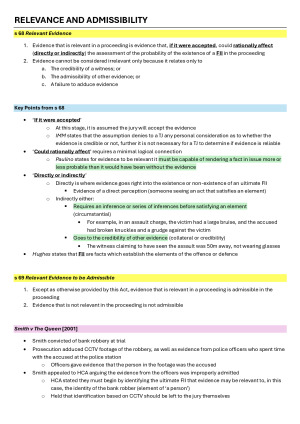 Comprehensive Mid-Sem Exam Notes for Evidence (2026) Contains all relevant EAWA sections, as well as supplementary commentary and cases, all laid out in a digestible manner for peak exam performance. Topics covered include admissibility, relevant sections on exclusions, course of the trial and the witness.