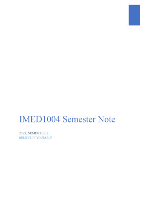 Note summary for IMED1004. Total 12 weeks content of lecture summary with comparison tables to assist with quick understanding between different concepts. Conclusive, with title and subtitles color coded for easy reading and understanding of the important concepts. Addition of mandarin translation to assist Chinese background students with certain vocabularies, and not affect the overall reading of notes. Covered topics: • Pathology • Microbiology & immunology • Inflammation • Health & nutrition • Neonatal immunology & breastfeeding • Signaling networks in the body • Drug related issues & addition • Diabetes • Cardiovascular diseases • Cell cycle, cell cycle control & apoptosis Hope this well covered note will be useful to hardworking students and save your time and lower your study pressure :)