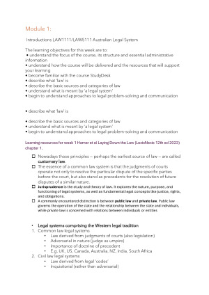 Everything you need to perform highly in the course- it's a broad course so this will definitely help where the text book is tough reading. I did okay. I chalked up 89 here so happy but maybe left some marks on the table. I am currently a Legal Studies Teacher studying my LLB and have previously tutored at a Uni. Check out my other notes for First and Second year subjects. Overview • Module 1 – Introductions • Module 2 – Institutions • Module 3 – Legal dispute resolution • Module 4 – Case law and precedent • Module 5 – Precedent in Australian courts • Module 6 – First Nations peoples and the Australian legal system • Module 7 – Legislation & law-making by Australian parliaments • Module 8 – Statutory interpretation part 1 • Module 9 – Statutory interpretation part 2 • Module 10 – Statutory interpretation part 3 • Module 11 – Professional legal practice