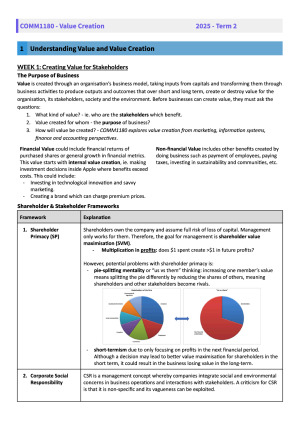 Comprehensive Notes for COMM1180 - IFY Course. These notes helped me score a HD. Rank 1 in entire cohort (2025 T2) in both video (91) and report (93) assignment. Topics Included: WEEK 1: Creating Value for Stakeholders WEEK 2: Value from Market Opportunities WEEK 3: Value from Pricing WEEK 4: Value from Technology WEEK 5: Time Value of Money WEEK 7: Value from Investment Decisions WEEK 8: Value for Investors WEEK 9: Firm Value and Cost of Capital WEEK 10: Value and Performance Measurement
