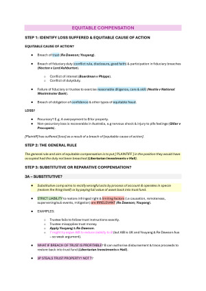 Elite exam notes for remedies LAWS5105. I got an HD in this subject by knowing these notes back to front. Attack plan format, easy to follow and apply in an exam setting. Topics include: TOPICS INCLUDED: 1. EQUITABLE COMPENSATORY REMEDIES (LOSS) – MONETARY AWARDS IN EQUITY 2. RESTITUTIONARY REMEDIES (GAIN) o GAIN-BASED AWARDS FOR WRONGS o GAIN-BASED AWARDS FOR NON-WRONGS – UNJUST ENRICHMENT o PROPRIETARY REMEDIES 3. COERCIVE REMEDIES o INJUNCTIONS o LCAD o APOLOGIES o SPECIFIC PERFORMANCE o ENFORCEMENT OF DEBT 4. EXEMPLARY REMEDIES 5. RECISSION