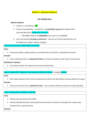 Elite, High Distinction LAWS3400 Notes Topics covered: 1. Introduction to evidence 2. Trials; Judicial Powers & Discretions 3. Adducing Evidence I 4. Adducing Evidence II 5. Proof and Relevance 6. Hearsay Evidence I 7. Hearsay Evidence II 8. Hearsay Evidence III; Admissions 9. Opinion Evidence 10. Tendency and Coincidence Evidence 11. Credibility and Character Evidence 12. Identification Evidence 13. Exam Preparation