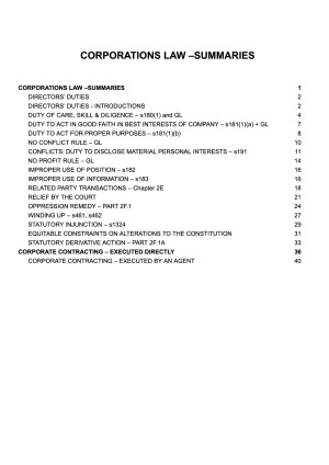CORPORATIONS LAW – SUMMARIES (contents) DIRECTORS’ DUTIES DIRECTORS’ DUTIES – INTRODUCTIONS DUTY OF CARE, SKILL & DILIGENCE – s180(1) and GL DUTY TO ACT IN GOOD FAITH IN BEST INTERESTS OF COMPANY – s181(1)(a) + GL DUTY TO ACT FOR PROPER PURPOSES – s181(1)(b) NO CONFLICT RULE – GL CONFLICTS: DUTY TO DISCLOSE MATERIAL PERSONAL INTERESTS – s191 NO PROFIT RULE – GL IMPROPER USE OF POSITION – s182 IMPROPER USE OF INFORMATION – s183 RELATED PARTY TRANSACTIONS – Chapter 2E RELIEF BY THE COURT OPPRESSION REMEDY – PART WINDING UP – s461, s462 STATUTORY INJUNCTION – s1324 EQUITABLE CONSTRAINTS ON ALTERATIONS TO THE CONSTITUTION STATUTORY DERIVATIVE ACTION – PART CORPORATE CONTRACTING – EXECUTED DIRECTLY CORPORATE CONTRACTING – EXECUTED BY AN AGENT