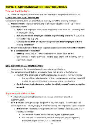 Scored a 92 (HD) using these notes alone. If you want a clear, structured, and exam-ready resource for MLL317 Superannuation Law, this is it. These notes are fully comprehensive and refined for 2024, designed to save you time and maximise marks. They consolidate everything you need into one place—no need to jump between lectures, readings, and tutorials. ✔️ Complete course coverage ✔️ Clear structure for exam answers ✔️ Integrated case summaries + key principles ✔️ Simplified explanations of complex topics ✔️ Built for quick revision + issue spotting under pressure Includes: Superannuation Contributions Complying Superannuation Funds Taxation of Superannuation Running a Superannuation Fund Self-Managed Super Funds (SMSFs) These notes are ideal if you want to study efficiently, understand the content (not just memorise), and walk into the exam confident.