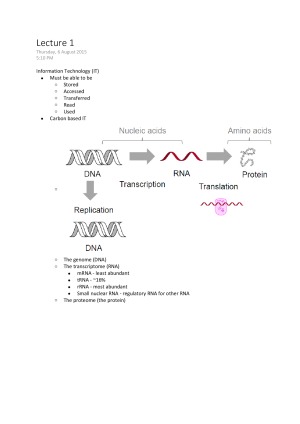 Dot point summary and diagrams for every MBLG1001 lecture and every topic covered in MBLG1001. Covers DNA structure, replication, RNA structure, transcription, protein structure, translation, lab applications and genetics.