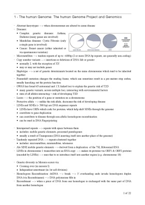This is a summary of my lecture notes (which I had written down in a book), which I used for my exam revision and it helped it quite a lot. It also includes a list of genes studied (linked to their disease and some key points) and lecture questions (with answers) which were given each week. Contents of summary notes include: - The Human Genome: The Human Genome Project and Genomics - Mendelian Genetics, Recombination, Haplotypes and Linkages - Human Genetics: Genetic Variation in Health and Disease - The Genetic Analysis of Populations - Linkage Disequilibrium and Non-Mendelian (complex) Genetics - The genetic analysis of populations Genome-wide association studies - GWAS - Sequencing the Human Genome, Next generation sequencing - Cancer Genetics - Gene expression and gene expression profiling - eQTL Epigenetics. DNA methylation Imprinting and X-inactivation - The Genetics of Ageing (Alzheimer’s disease) Stem cells Induced. Pluripotent Stem Cells - Chromosomal Abnormalities - Genetic Testing Hope this helps you out as much as it did to me!